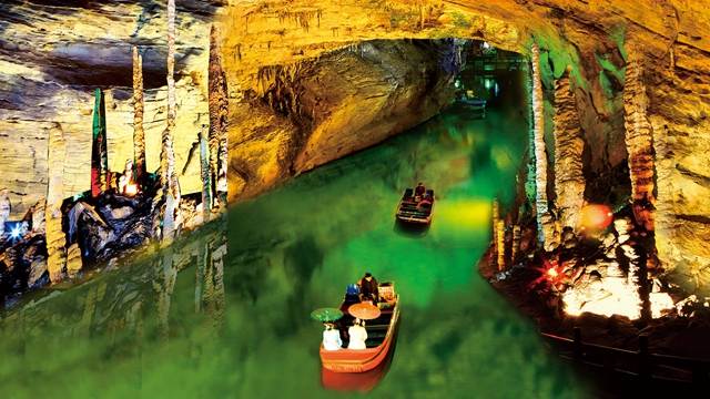 當漫游在悠悠的響水河上時,洞頂會時有水珠滴落在頭上,涼涼的。黃龍洞第二層洞中的一條暗河,響水河全長2820米,現在只能游覽一部分800米,時間約須8分鐘。響水河平均水深6米,最深有12米,水溫保持在16℃,是國家一級重點保護動物娃娃魚的理想生存環(huán)境。