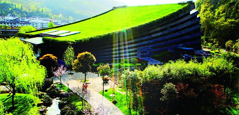 音樂廳與黃龍洞相毗鄰,背靠植被茂密的黃龍洞山體,面朝廣闊田園,南鄰潺潺東流的索溪水,音樂廳屋頂被綠蔭花草覆蓋,綠化面積達(dá)3000平方米,是我國(guó)目前最大的單體斜坡綠化屋頂,也是世界上唯一的一家生態(tài)劇院。音樂廳外墻由張家界青石頁巖構(gòu)建成的音符弦線幕墻與自然融合一體,如同一本即將展開等待世人閱讀的張家界文化寶典,又如鑲嵌在張家界的一塊翡翠。